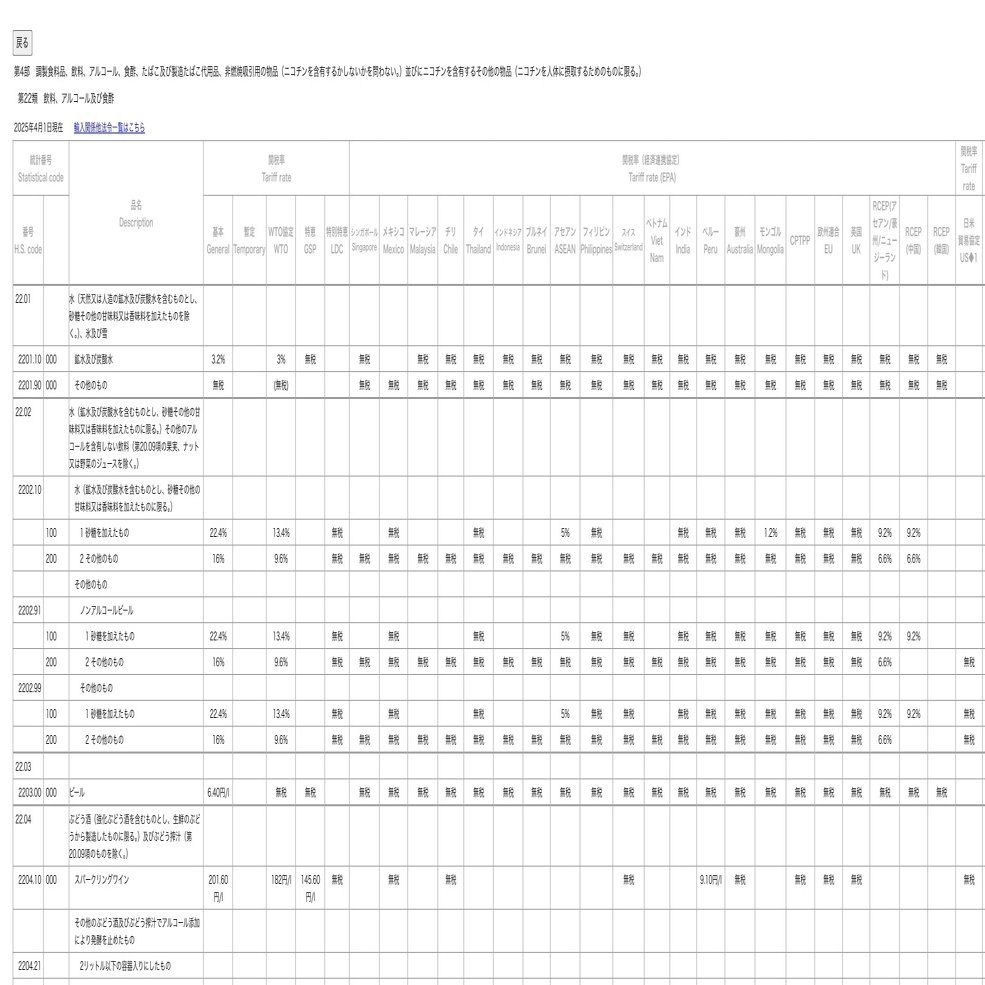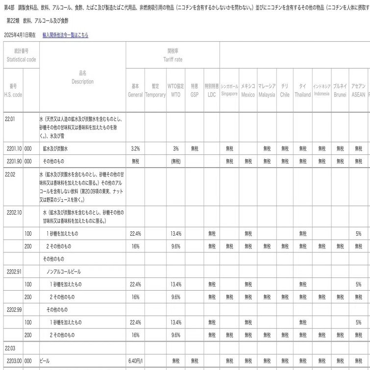 例えば下記は、飲料、アルコール及び食酢に関する日本の輸入にかかるHSコードと税率です。