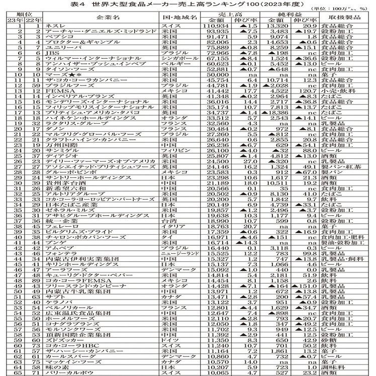 上位にはネスレ、P&G、ユニリーバなどの総合食品会社やペプシコ、コカコーラなどのよく目にする会社名が並んでおり、その多くを欧米企業が占めています。