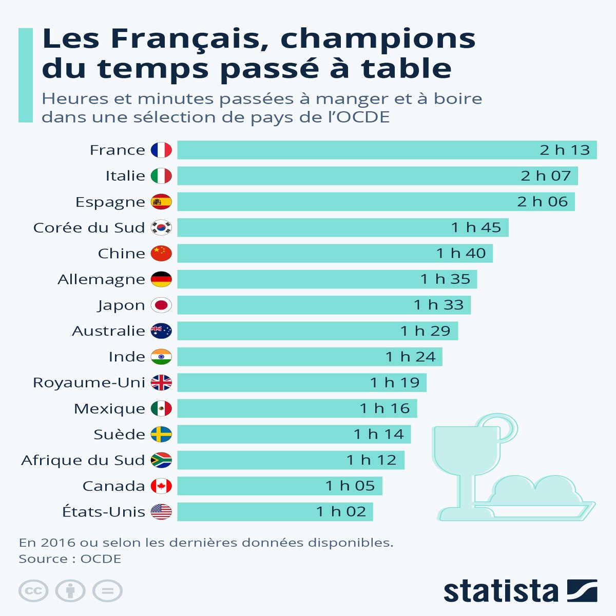 南ヨーロッパ(イタリア、ギリシャ、スペイン)やフランス、アジアは食事に時間をかける一方で、カナダとアメリカは最下位に位置しています。